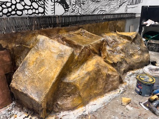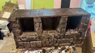 Papier-mâché mixed with cement. Wood combined with plastics. PVA glue, paint, trial and error.