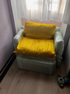 From that one sofabed came two armchairs, shelving, and cupboard materials.