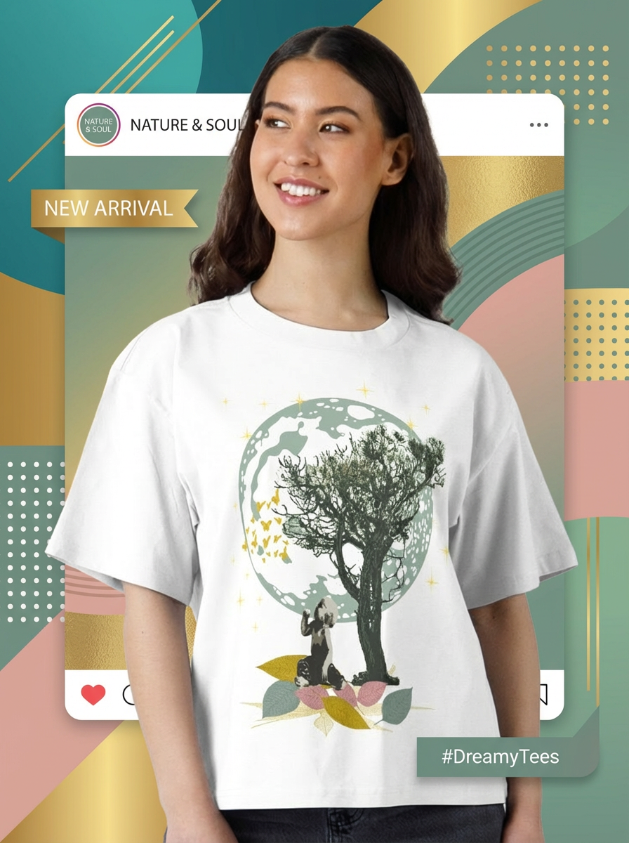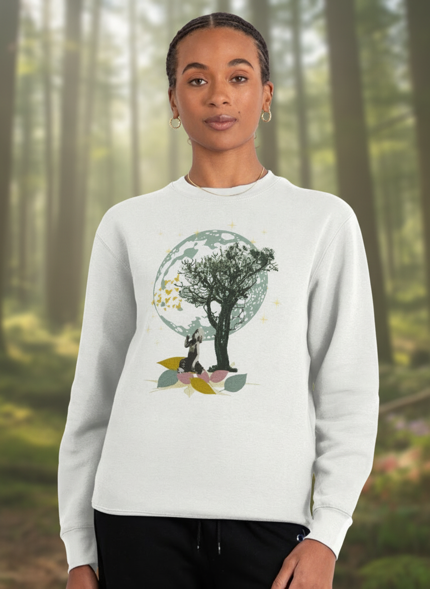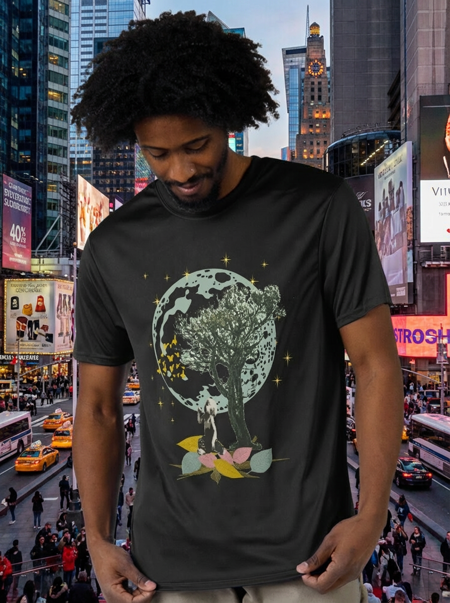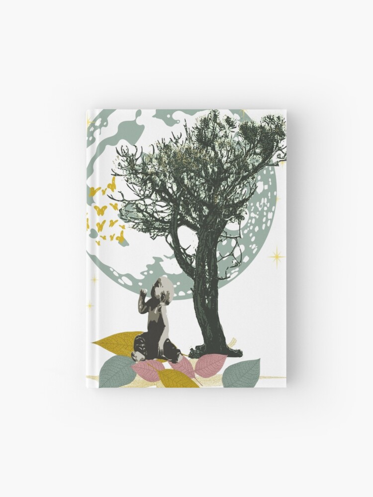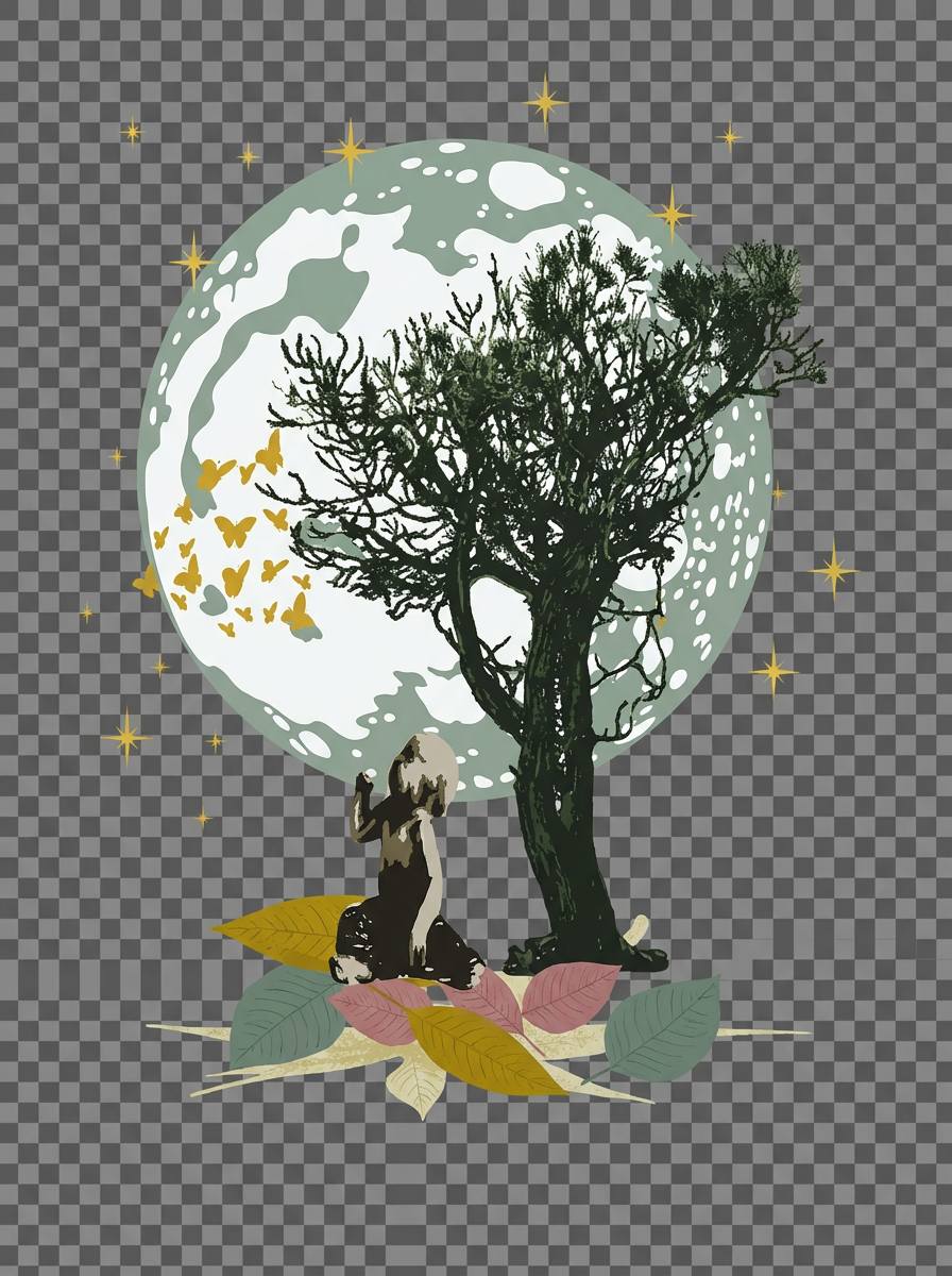 In this illustrative collage, a young child sits beneath the sheltering branches of a tree, mesmerized by the graceful dance of butterflies. Above, the moon appears larger than life, watching over the scene in calm silence. It’s a moment suspended in time—where imagination, nature, and emotion exist in perfect harmony.